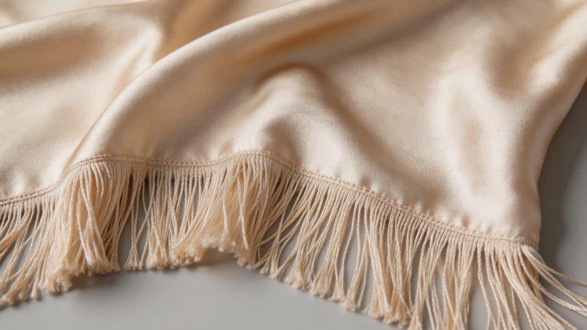 Some silk scarves — particularly large rectangular wraps and silk stoles — feature fringed or tasseled edges instead of rolled hems. Fringe adds a bohemian, textured element to the scarf's design. On high-quality silk scarves, fringe is created from the fabric's own warp threads (self-fringe), not glued or sewn on separately.