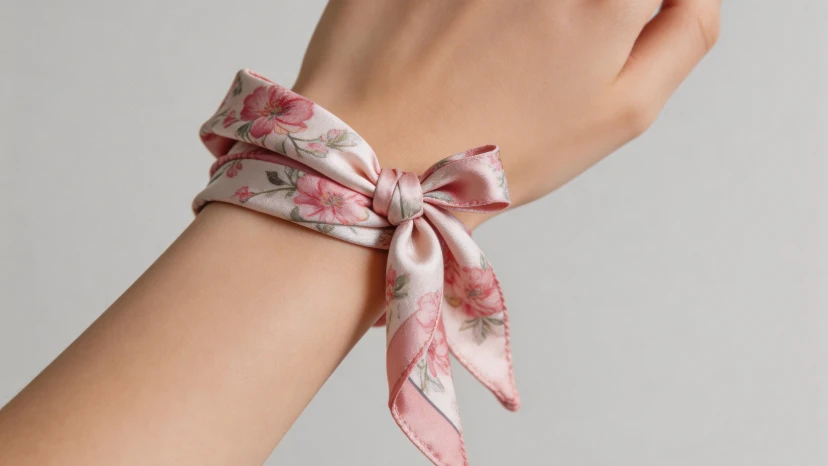 A small silk scarf wrapped around the wrist functions like a fabric bracelet — adding color, texture, and a touch of personality without the weight or formality of jewelry.