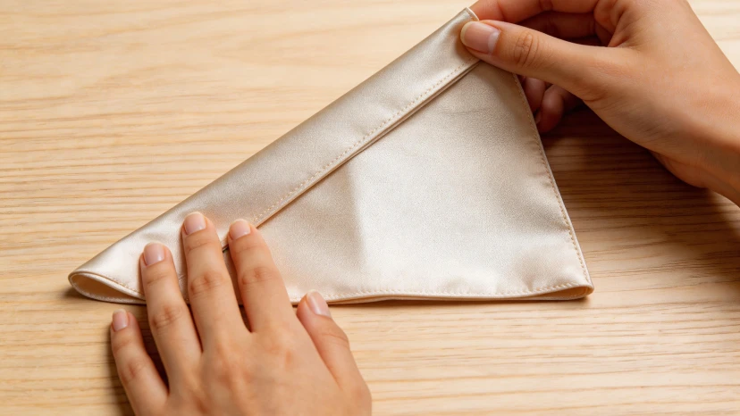 This is the most common starting point for tying a silk scarf. Lay your square silk scarf flat on a clean surface. Take one corner and fold it diagonally to the opposite corner, forming a triangle. The bias fold gives you a long folded edge and a pointed end, which creates a beautiful drape when wrapped around the neck or head. This fold works best with square silk scarves in sizes 70cm × 70cm and above.