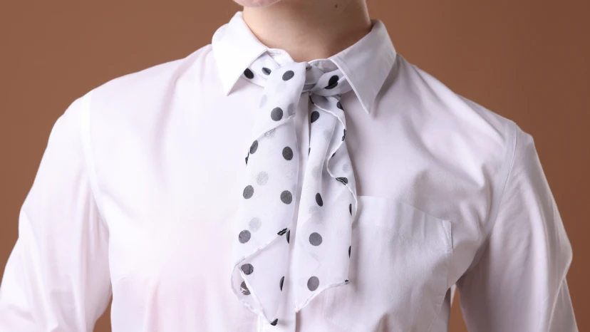 The cravat is a more structured silk scarf look that mimics the appearance of a loose necktie. It adds instant polish to blouses, button-down shirts, and blazers — making it a favorite for office wear and business casual settings.