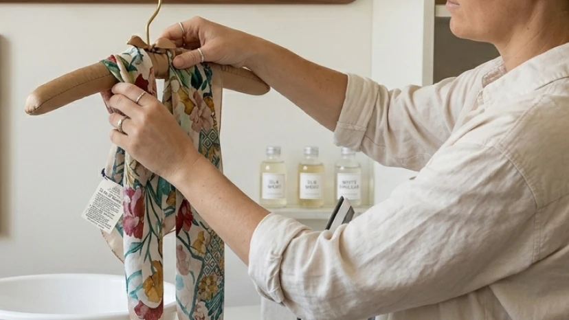 After each wearing, gently untie your silk scarf and shake it out to release any creases from knotting. Hang it loosely over a padded hanger or drape it over a smooth rack to let any fold lines relax naturally. If a crease has set in from a tight knot, hang the scarf in a steamy bathroom — the ambient moisture will soften the silk fibers and allow the crease to release.